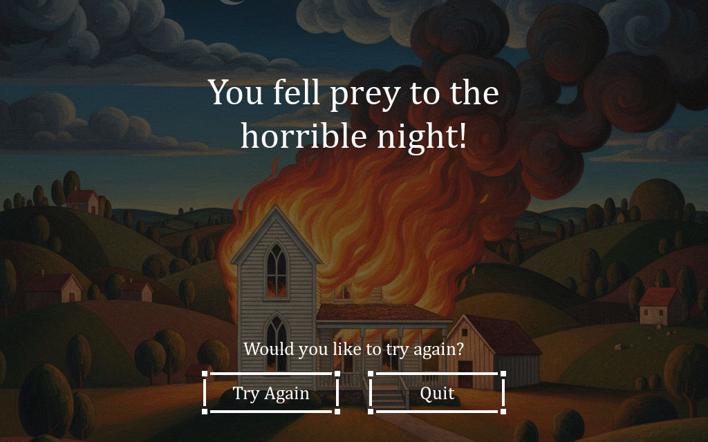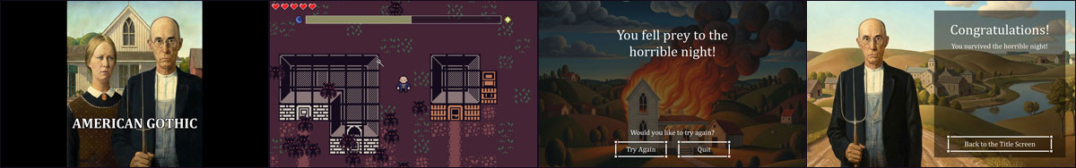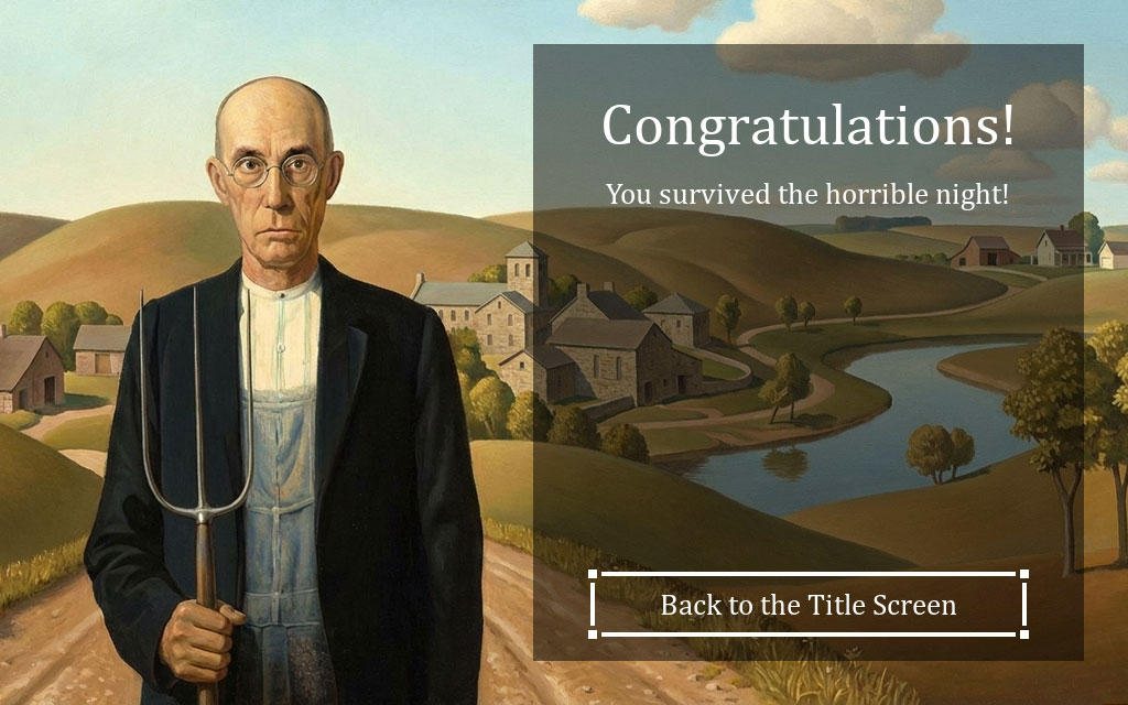 I also used another of Grant Wood's paintings from the same year, Stone City Iowa, in additional prompts for the "game over" screen and the "win" screen.